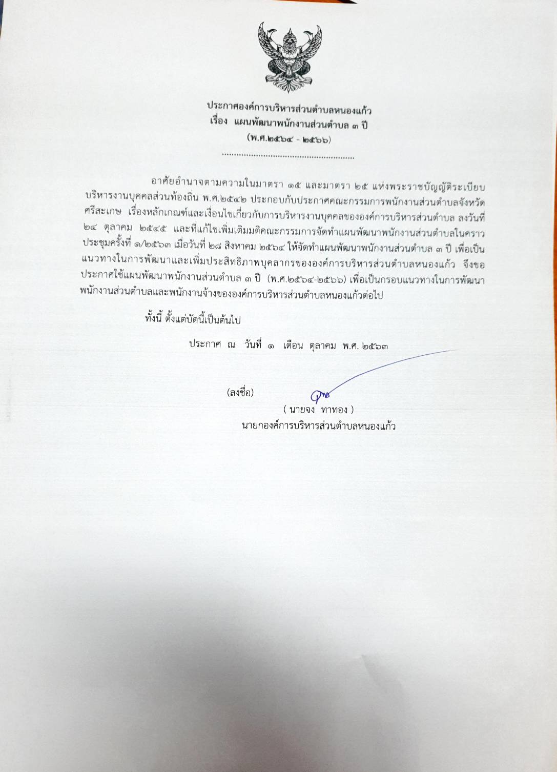 ประกาศจัดตั้งสโมสร อบต.หนองแก้ว